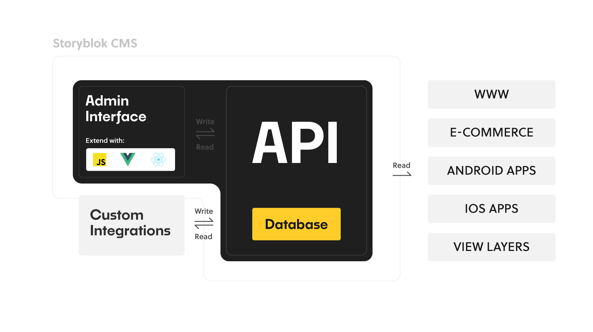 Podejście API-first - Storyblok oddziela warstwę prezentacji contentu od warstw aplikacji i danych. W takiej architekturze komunikacja frontendu z backendem odbywa się przez API Storyblok. Daje to większą elastyczność m.in. w doborze frameworka, czy dostarczaniu treści na różne platformy i urządzenia. Aplikacje tworzone w ten sposób są bardziej responsywne i wydajne.