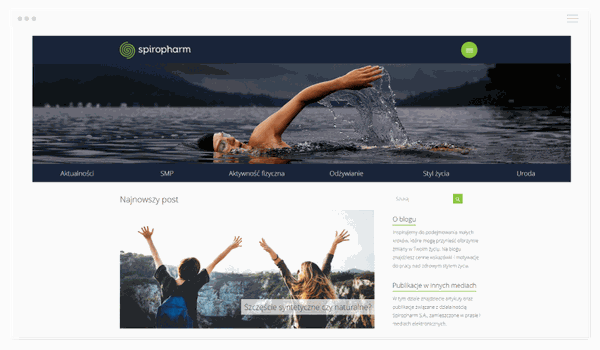 Creating a lifestyle blog for Spiropharm. It was important for the blog to remind the company's official website graphically. It was designed with a special focus on simplicity, so that the reader could fully focus on the article read. On the blog you can find valuable tips on active lifestyle, motivation to achieve your goals, weight loss, sports, work-life balance, and above all the influence of spirulina, the main ingredient of spiropharm brand supplements on the body.